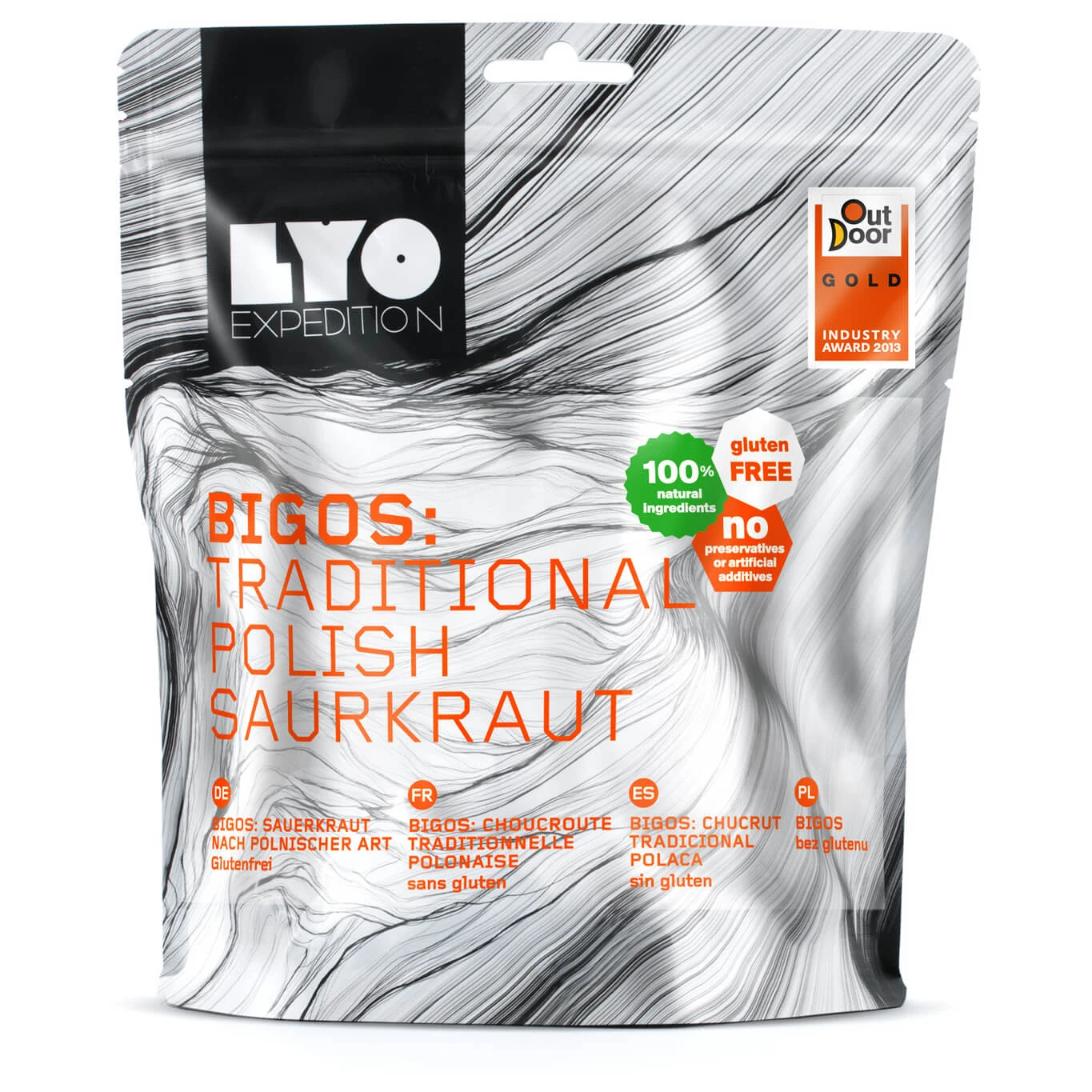 Ein deftiger Krauteintopf für unterwegs das ist Bigos: Traditional Polish Sauerkraut von Lyo Food. Für dieses herzhafte Hauptgericht wurden nur natürliche Zutaten verwendet. Auf Konservierungs- oder Zusatzstoffe sowie Geschmacksverstärker und künstliche Aromen wurde hierbei bewusst verzichtet. Obendrein ist dieses Gericht glutenfrei. Für lange Touren mit limitiertem Gepäck ist diese gefriergetrocknete Mahlzeit durch ihr kleines Packmaß, geringes Gewicht sowie eine einfache Zubereitung wie gemacht. Zutaten: Sauerkraut 60%, Schweinefleisch 20%, Hähnchenbrustfilet 7%, Zwiebel 5%, Champignons 2%, getrocknete Pflaumen, getrocknete Steinpilze, Tomatenmark, Rapsöl, Kräuter, Pfeffer